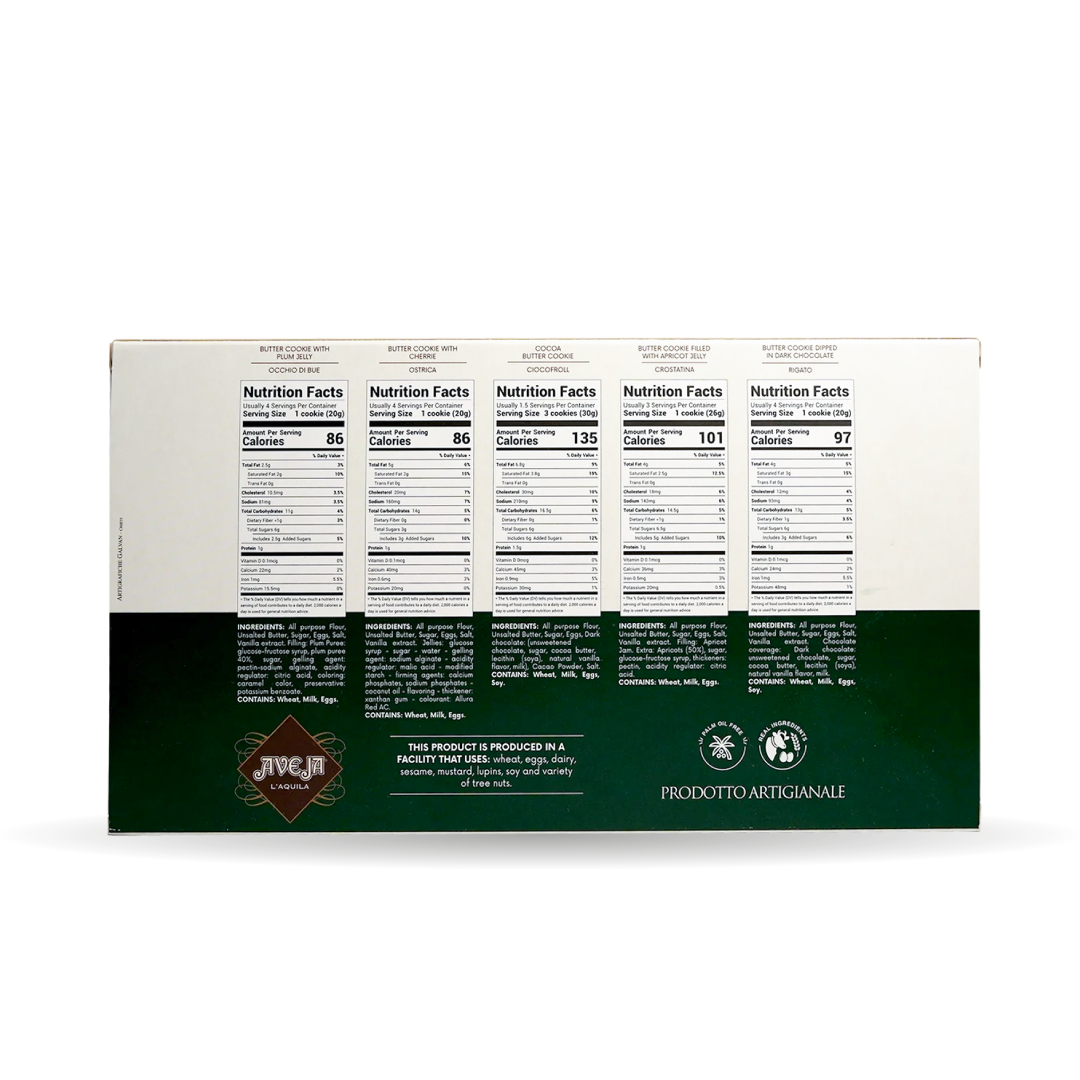 Butter Cookie Filled with Apricot Jelly – Crostatina: Italian Wheat All-purpose Flour, Unsalted Butter, Sugar, Italian Fresh Eggs, Salt, Vanilla extract. Filling: Apricot Jam. Extra: Apricots (50%), sugar, glucose-fructose syrup, thickeners: pectin, acidity regulator: citric acid. CONTAINS: Wheat, Milk, Eggs.