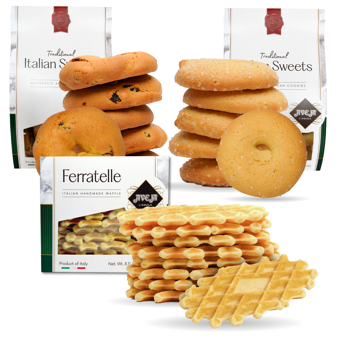 This collection celebrates three beloved recipes: wine-kissed Ciambelline al Vino Bianco, raisin-filled Ciambelline all’Uvetta, and the iconic Ferratelle from Abruzzo, handmade on cast iron plates. No artificial flavors, no shortcuts—just the honest taste of tradition.